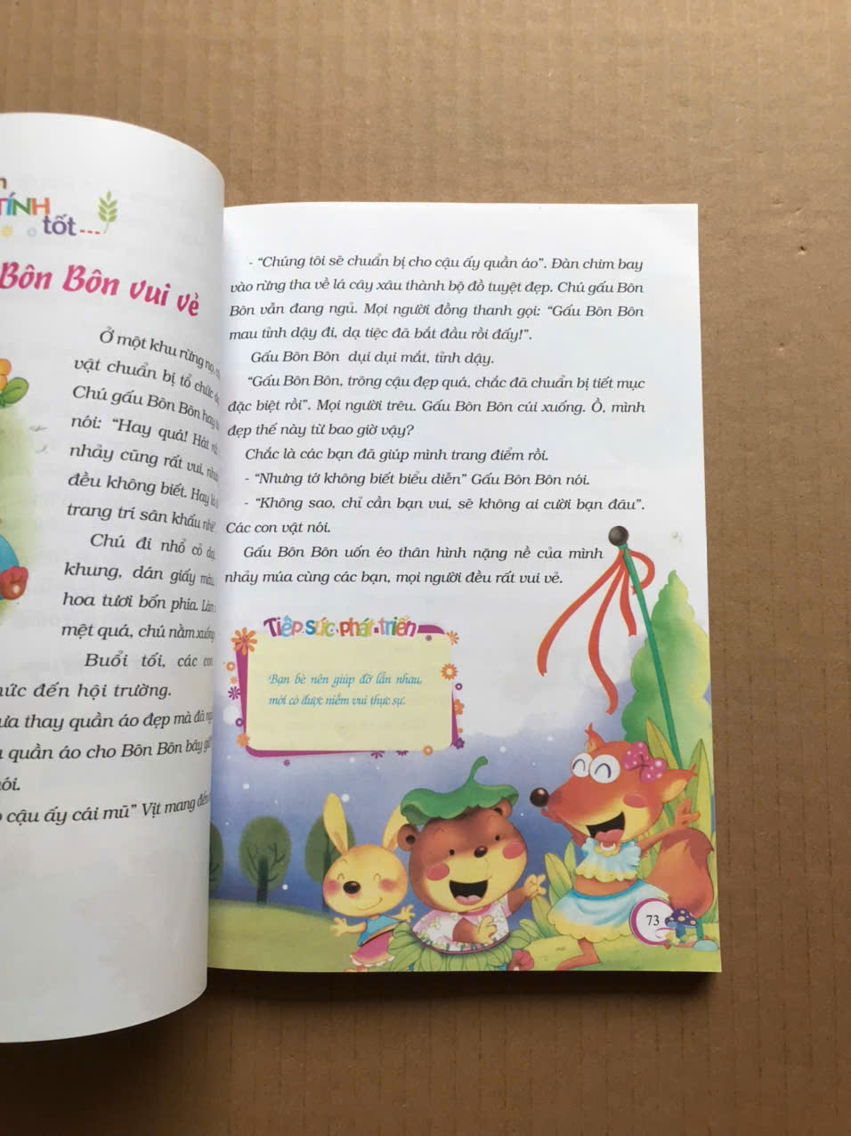 Sau mỗi câu chuyện đều có phần Tiếp sức phát triển, là bài học được rút ra từ câu chuyện, giúp bé rèn luyện các đức tính tốt như: yêu thương, chia sẻ, giúp đỡ lẫn nhau, nhường nhịn, chân thành, chăm chỉ, kiên trì, nỗ lực..