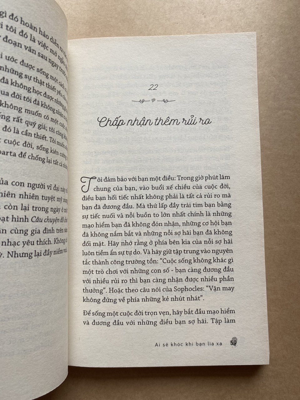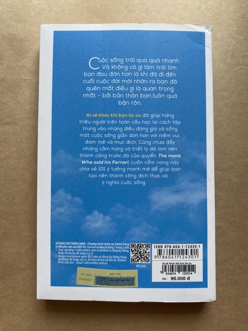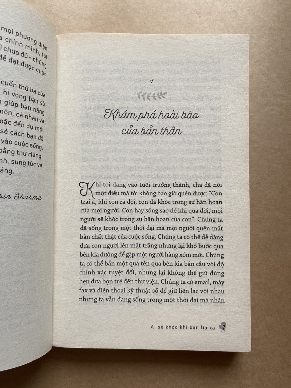 Ai sẽ khóc khi bạn lìa xa đã giúp hàng triệu người trên toàn cầu học lại cách tập trung vào những điều đáng giá và sống một cuộc sống giản đơn hơn với niềm vui, đam mê và mục đích. Cùng chứa đầy những cảm hứng và triết lý đã làm nên thành công trước đó của quyển The monk Who sold his Ferrari, cuốn cẩm nang này chia sẻ 101 ý tưởng mạnh mẽ để giúp bạn tạo nên thành công đích thực và ý nghĩa cuộc sống.