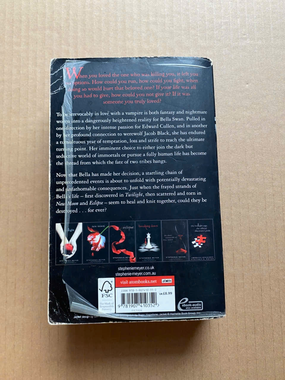 When you loved the one who was killing you, it left you no options. How could you run, how could you fight, when doing so would hurt that beloved one? If your life was all you had to give, how could you not give it? If it was someone you truly loved? To be irrevocably in love with a vampire is both fantasy and nightmare woven into a dangerously heightened reality for Bella Swan. Pulled in one direction by her intense passion for Edward Cullen, and in another by her profound connection to werewolf Jacob Black, a tumultuous year of temptation, loss, and strife have led her to the ultimate turning point. Her imminent choice to either join the dark but seductive world of immortals or to pursue a fully human life has become the thread from which the fates of two tribes hangs. Now that Bella has made her decision, a startling chain of unprecedented events is about to unfold with potentially devastating, and unfathomable, consequences. Just when the frayed strands of Bella's life--first discovered in "Twilight," then scattered and torn in "New Moon" and "Eclipse"--seem ready to heal and knit together, could they be destroyed... forever? The astonishing, breathlessly anticipated conclusion to the Twilight Saga, "Breaking Dawn "illuminates the secrets and mysteries of this spellbinding romantic epic that has entranced millions.