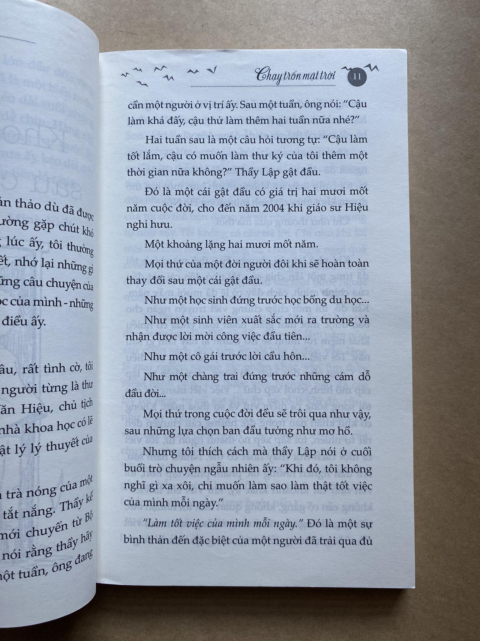 Nhiều câu chuyện giản dị, ngẫu hứng nhưng lại khiến ta giật mình nhìn lại những mối quan hệ quan trọng nhưng lại bị bỏ quên giữa bộn bề cuộc sống. Đã lâu ta không về thăm nhà, vì bận. Đã lâu ta không ngồi café với đứa bạn thân, vì bận. Ta đã quên thói quen gọi điện cho bố mỗi ngày, vì bận. Những câu chuyện trong Chạy trốn mặt trời không đơn thuần là sự sẻ chia, mà còn thúc giục, khích lệ thế hệ trẻ hướng tới sự đổi thay trong cách nhìn về cuộc sống của chính mình.