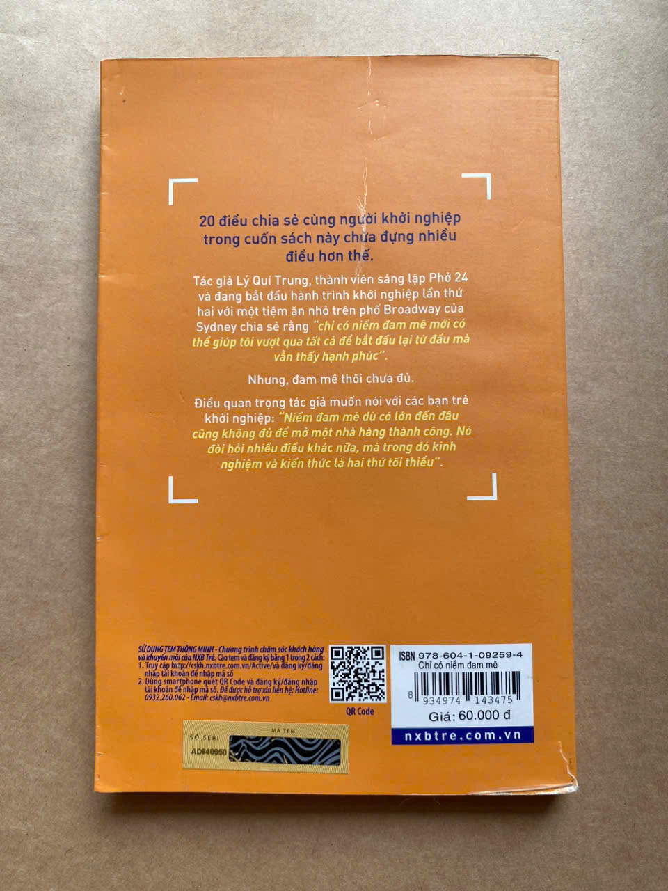 Tác giả Lý Quí Trung, thành viên sáng lập Phở 24 và đang bắt đầu hành trình khởi nghiệp lần thứ hai với một tiệm ăn nhỏ trên phố Broadway của Sydney chia sẻ rằng "chỉ có niềm đam mê mới có thể giúp tôi vượt qua tất cả để bắt đầu lại từ đầu mà vẫn thấy hạnh phúc".