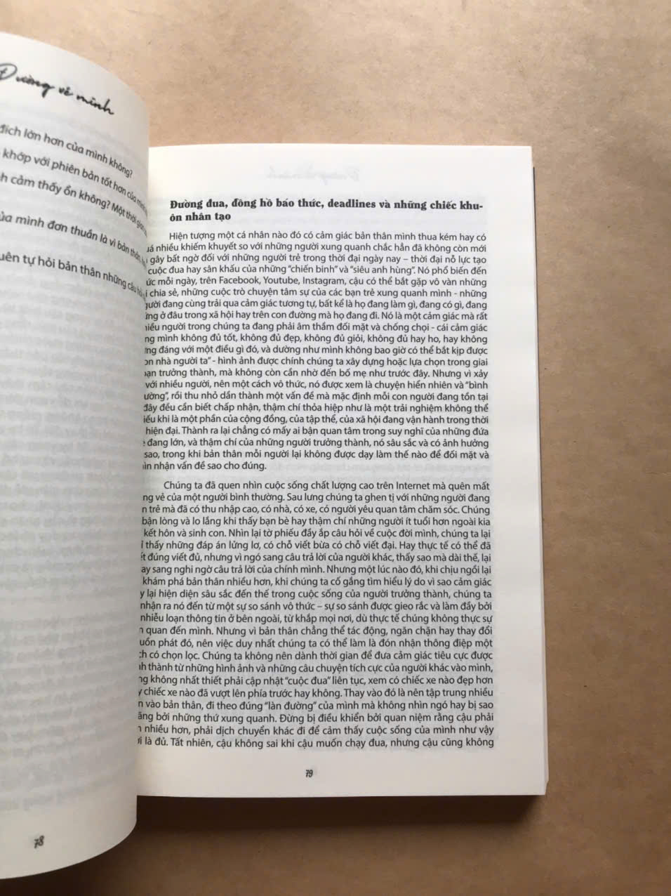 Cuốn sách “Đường về mình” sẽ cùng cậu đưa ra những vấn đề và tìm kiếm manh mối cho những câu trả lời mà có thể cậu đang cần biết về toàn bộ trải nghiệm con người của mình ở đây. Tuy nhiên, đặc biệt hơn cả vẫn là việc cậu chủ động tự phản ánh và đặt ra cho bản thân những câu hỏi dựa vào những gì cậu đọc được, nghe được và quan sát được để đi đến kết luận có thể làm thoả mãn mình. Điều này rất quan trọng, vì khi cậu nghiêm túc hỏi có nghĩa là cậu đã đi được một nửa chặng đường, và cậu đã dám thừa nhận nỗi trăn trở của bản thân, có trách nhiệm hơn với chính mình. Đó là một dấu hiệu cho thấy rằng cậu đang bắt đầu để ý đến bản thân và đang thực sự hiện diện trong cuộc sống của mình – cậu đang sống ít hơn trong những kế hoạch và những ý tưởng được tính toán trước, và tập trung nhiều hơn vào khoảnh khắc hiện tại.