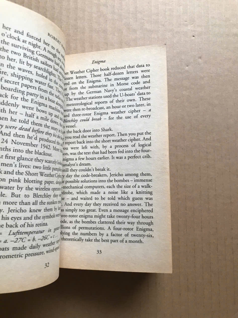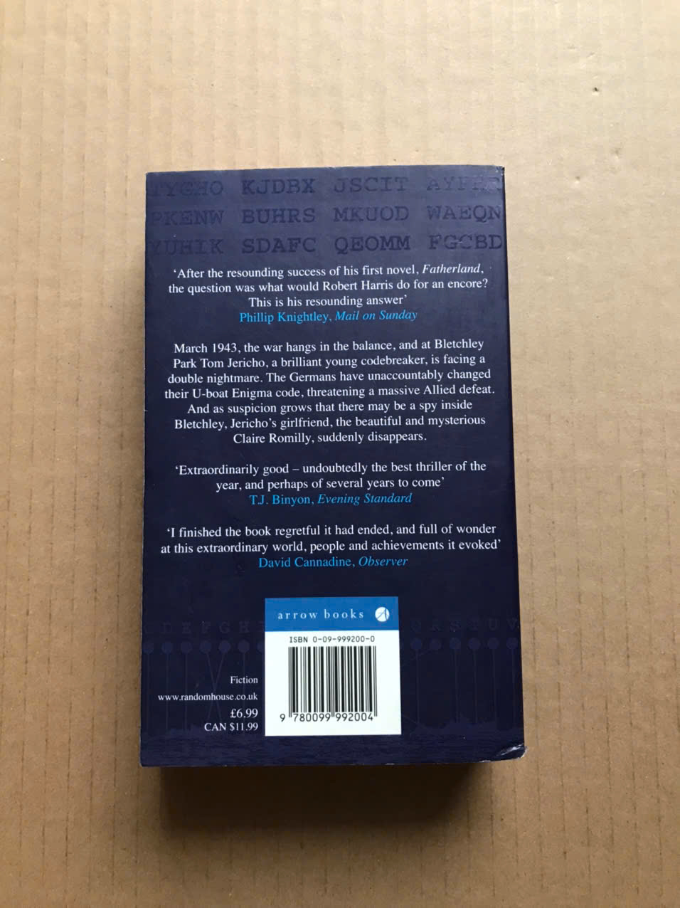 England 1943. Much of the infamous Nazi Enigma code has been cracked. But Shark, the impenetrable operational cipher used by Nazi U-boats, has masked the Germans' movements, allowing them to destroy a record number of Allied vessels. Feeling that the blood of Allied sailors is on their hands, a top-secret team of British cryptographers works feverishly around the clock to break Shark. And when brilliant mathematician Tom Jericho succeeds, it is the stuff of legend. . . .