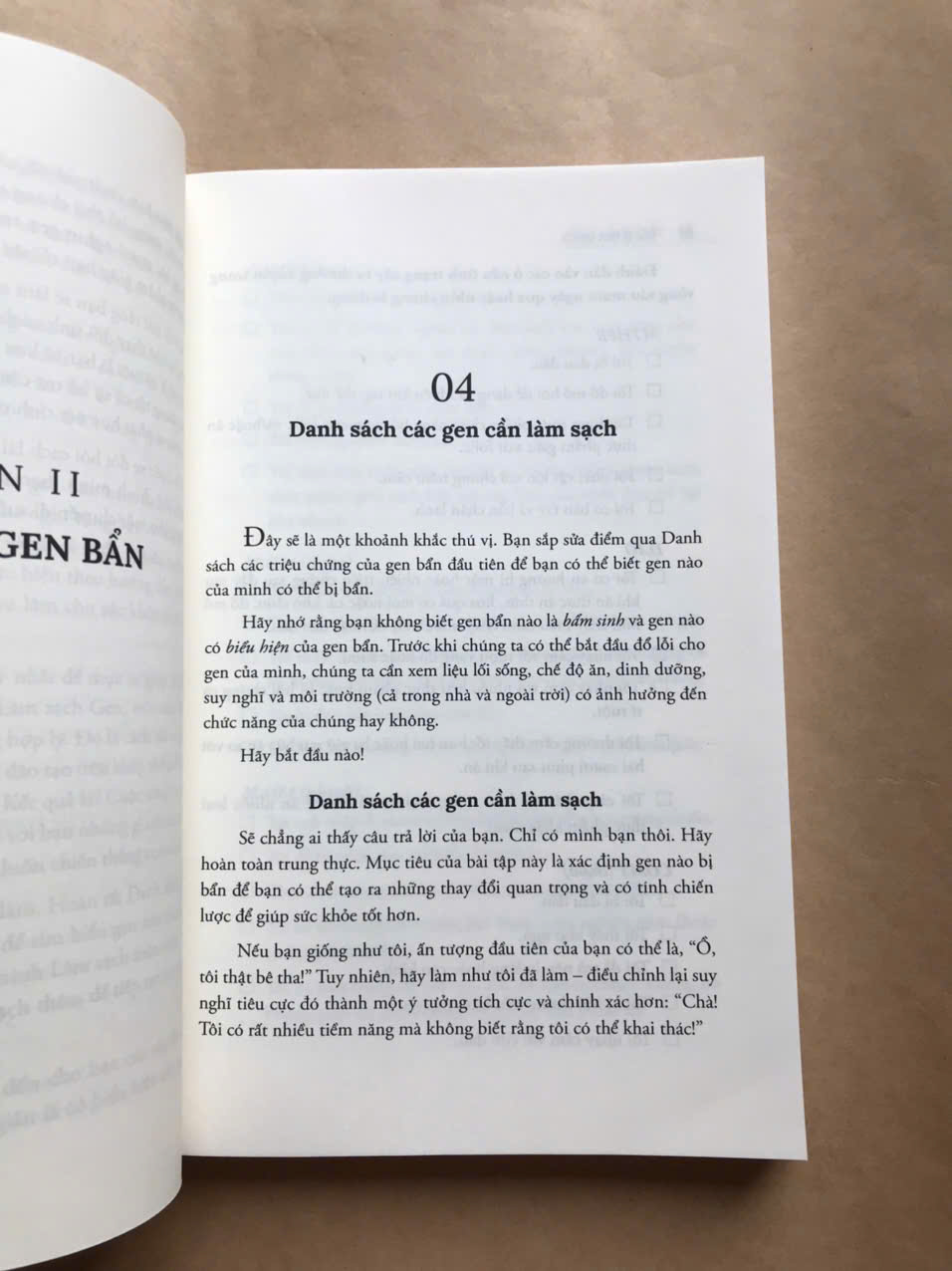 Sau đó, tác giả tập trung vào Phương thức làm sạch gen trong 4 tuần - một chương trình được ông thiết kế đẻ xác định xem bạn có nhóm gen bẩn chính nào hay không và các phương thức ăn uống, tập luyện để giải độc và giảm căng thẳng. Độc giả có thể tham khảo thêm nhiều thông tin khác của việc chăm sóc gen ở các phần sau của sách.