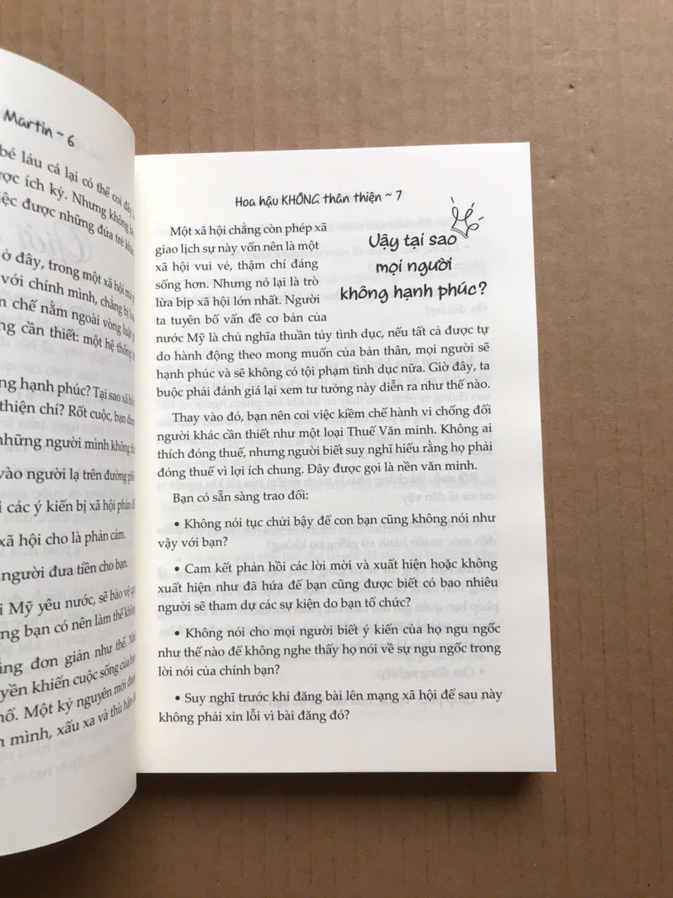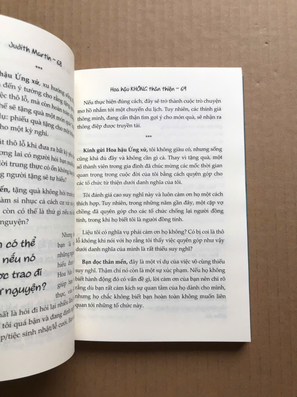 Judith Martin được biết đến nhiều hơn với bút danh Miss Manners, là một nhà báo, tác giả về nghi thức xã giao người Mỹ. Cuốn sách “Hoa hậu không thân thiện” đã khai sáng, cung cấp thông tin và làm thỏa mãn người đọc bằng những lời khuyên được đưa ra bằng lối dí dỏm đặc trưng của cô. Bạn sẽ biết cách cư xử đúng mực trong những tình huống khó xử từ lâu như: Tiền mừng đám cưới, tranh cãi trong gia đình, họp mặt trong kỳ nghỉ, tổ chức tiệc, tặng/nhận quà, những lời cảm ơn,...và cách đối phó với những người vi phạm ranh giới của phép xã giao.