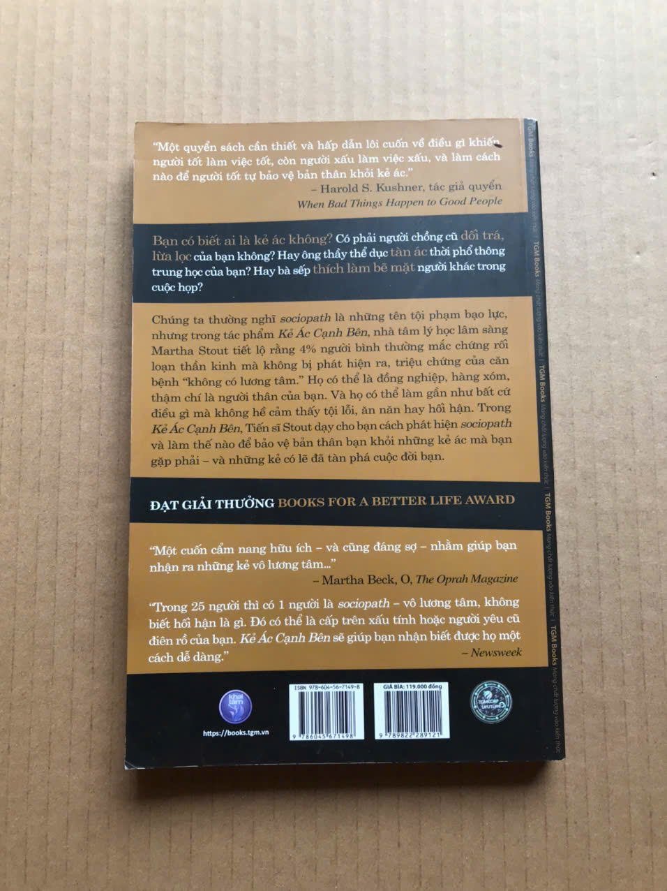 Chúng ta thường nghĩ những người sociopath (rối loạn nhân cách chống xã hội) là những tên tội phạm bạo lực, nhưng trong tác phẩm Kẻ Ác Cạnh Bên (đạt giải thưởng Books For A Better Life Award), nhà tâm lý học lâm sàng Martha Stout tiết lộ rằng có đến 4% người bình thường mắc chứng rối loạn thần kinh mà không bị phát hiện ra, triệu chứng của căn bệnh “không có lương tâm.” Họ có thể là đồng nghiệp, hàng xóm, thậm chí là người thân của bạn. Và họ có thể làm gần như bất cứ điều gì mà không hề cảm thấy tội lỗi, ăn năn hay hối hận. Nói tóm lại, cứ 25 người thì có 1 người là sociopath - nghe rất điên rồ, đáng sợ nhưng đó lại là sự thật.