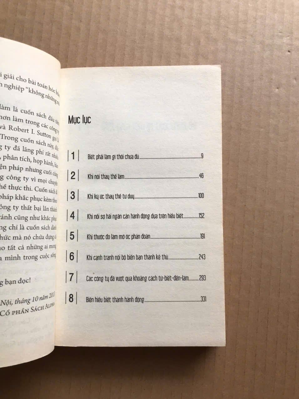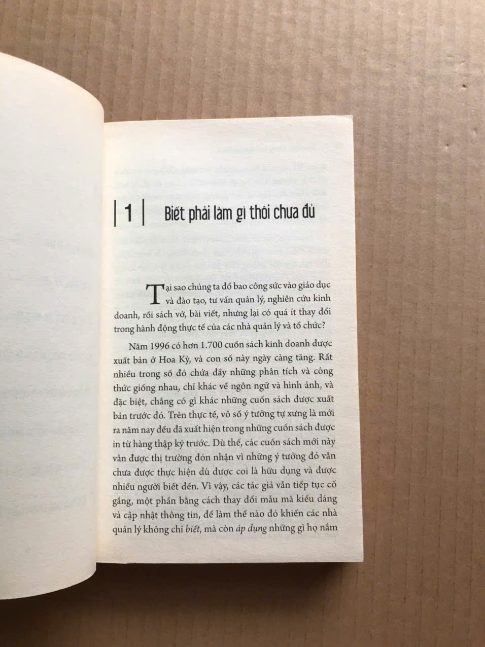 Trong cuốn sách này, Jeffrey Pfeffer và Robert Sutton, những tác giả và giảng viên nổi tiếng, đã xác định nguyên nhân của khoảng cách từ-biết-tới-làm và đưa ra cách lấp đầy khoảng cách đó. Thông điệp trong cuốn sách rất rõ ràng – các công ty muốn biến kiến thức thành hành động phải tránh xa “bẫy nói suông”(smart talk trap). Những kế hoạch, phân tích, cuộc họp, buổi trình bày của nhà điều hành để truyền cảm hứng cho công việc không thể thay thế cho hành động.