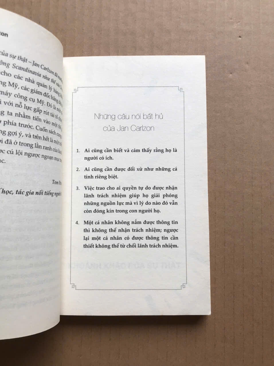 Được mời về làm Chủ tịch hãng hàng không SAS (Scandinavian Airlines) của Thụy Điển khi hãng hàng không này đang thua lỗ 30 triệu đô-la, chỉ một thời gian không lâu sau đó, Jan Carlzon đã biến SAS thành hãng hàng không đúng giờ nhất tại châu Âu và có lợi nhuận chỉ sau một năm ông tiếp quản. Sự thật đằng sau thành công này là gì? Jan Carlzon đã dùng thứ phép thuật nào để biến SAS từ cô bé lọ lem thành công chúa? Tất cả sẽ được tiết lộ trong cuốn sách Khoảnh khắc của sự thật – Jan Carlzon đã marketing hóa hãng hàng không Scandinavia như thế nào.