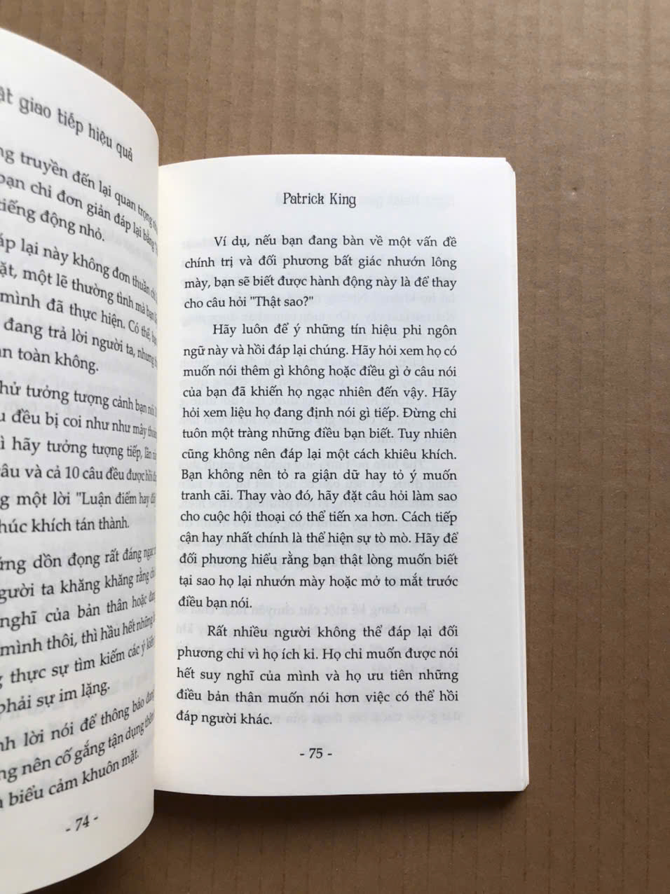 Cuốn sách của Patrick King tập trung vào các chiến lược và kĩ thuật giúp bạn trở nên cuốn hút, thể hiện được nhiều cảm xúc hơn trong giọng điệu, và làm thế nào để trao đổi thông tin tế nhị hơn. Nó giúp bạn mở lòng đủ để tạo nên một cuộc đối thoại ý nghĩa, thay vì chỉ ngồi đợi điều bất ngờ xảy ra. Bất kỳ ai cũng có thể áp dụng các phương pháp trong “Nghệ thuật giao tiếp hiệu quả”, để ngày một hoàn thiện kỹ năng mềm. Nếu tin rằng giao tiếp chính là năng lực không thể thiếu trong thời đại này, đây là cuốn sách sẽ giúp ích rất nhiều cho bạn
