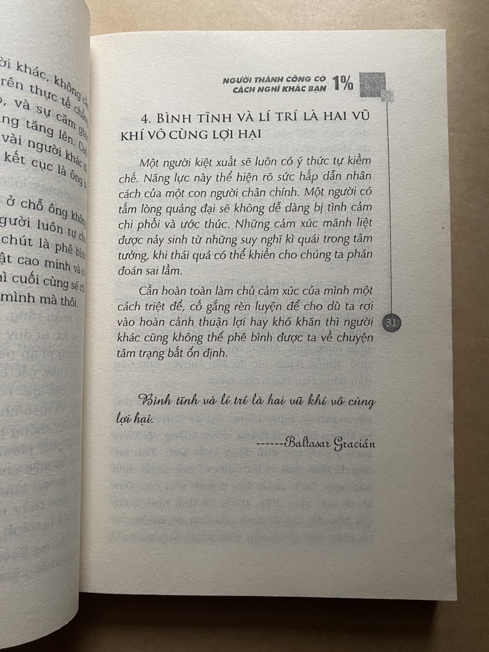 Cuốn sách NGƯỜI THÀNH CÔNG CÓ 1% CÁCH NGHĨ KHÁC BẠN, giới thiệu với bạn về quy tắc trí tuệ nhân sinh của Baltasar Gracián, một vị giáo sĩ Tây Ban Nha, sống ở thế kỷ XVII. Ông là người có tri thức uyên bác, đồng thời có trí tuệ và kinh nghiệm nhân sinh vô cùng phong phú. Triết gia nổi tiếng Netzsche từng ca ngợi: “Trí tuệ và kinh nghiệm nhân sinh của Gracián vẫn tuyệt vời cho đến tận ngày hôm nay, và không gì có thể sánh bằng”.