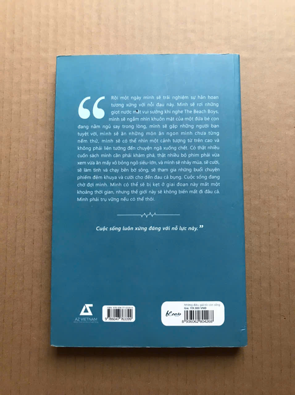 “Rồi một ngày mình sẽ trải nghiệm sự hân hoan tương xứng với nỗi đau này. Mình sẽ rơi những giọt nước mắt vui sướng khi nghe The Beach Boys, mình sẽ ngắm nhìn khuôn mặt của một đứa bé con đang nằm ngủ say trong lòng, mình sẽ gặp những người bạn tuyệt vời, mình sẽ ăn những món ăn ngon mình chưa từng nếm thử, mình sẽ có thể nhìn một cảnh tượng từ trên cao và không phải liên tưởng đến chuyện ngã xuống chết. Có thật nhiều cuốn sách mình cần phải khám phá, thật nhiều bộ phim mình phải vừa xem vừa ăn mấy xô bỏng ngô siêu-lớn, và mình sẽ nhảy múa, sẽ cười, sẽ làm tình và chạy bên bờ sông, sẽ tham gia những buổi chuyện phiếm đêm khuya và cười cho đến đau cả bụng. Cuộc sống đang chờ đợi mình. Mình có thể sẽ bị kẹt ở giai đoạn này mất một khoảng thời gian, nhưng thế giới này sẽ không biến mất đi đâu cả. Mình phải trụ vững nếu có thể thôi. Cuộc sống luôn xứng đáng với nỗ lực này.”