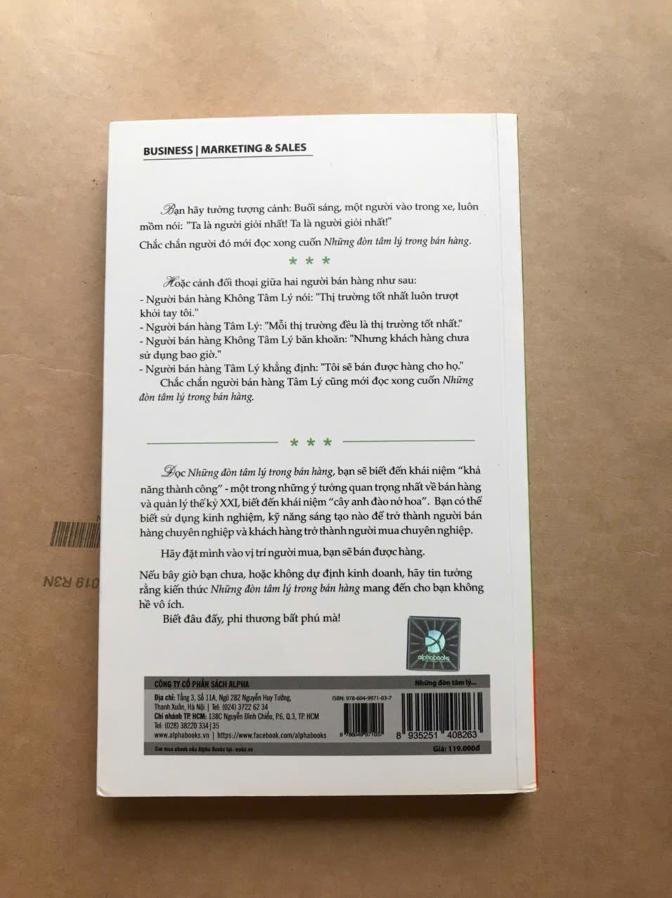 Đọc Những Đòn Tâm Lý Trong Bán Hàng (Psychology Of Selling, bạn sẽ biết đến khái niệm "khả năng thành công" - một trong những ý tưởng quan trọng nhất về bán hàng và quản lý thế kỷ 21, biết đến khái niệm "cây anh đào nở hoa", hoặc bạn cần sử dụng kinh nghiệm, kỹ năng sáng tạo nào để bạn trở thành người bán hàng chuyên nghiệp và khách hàng cũng thành người mua chuyên nghiệp.
