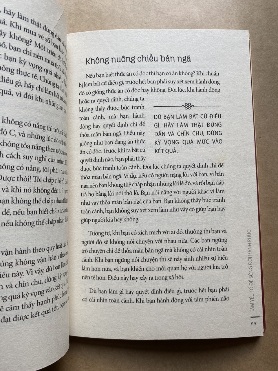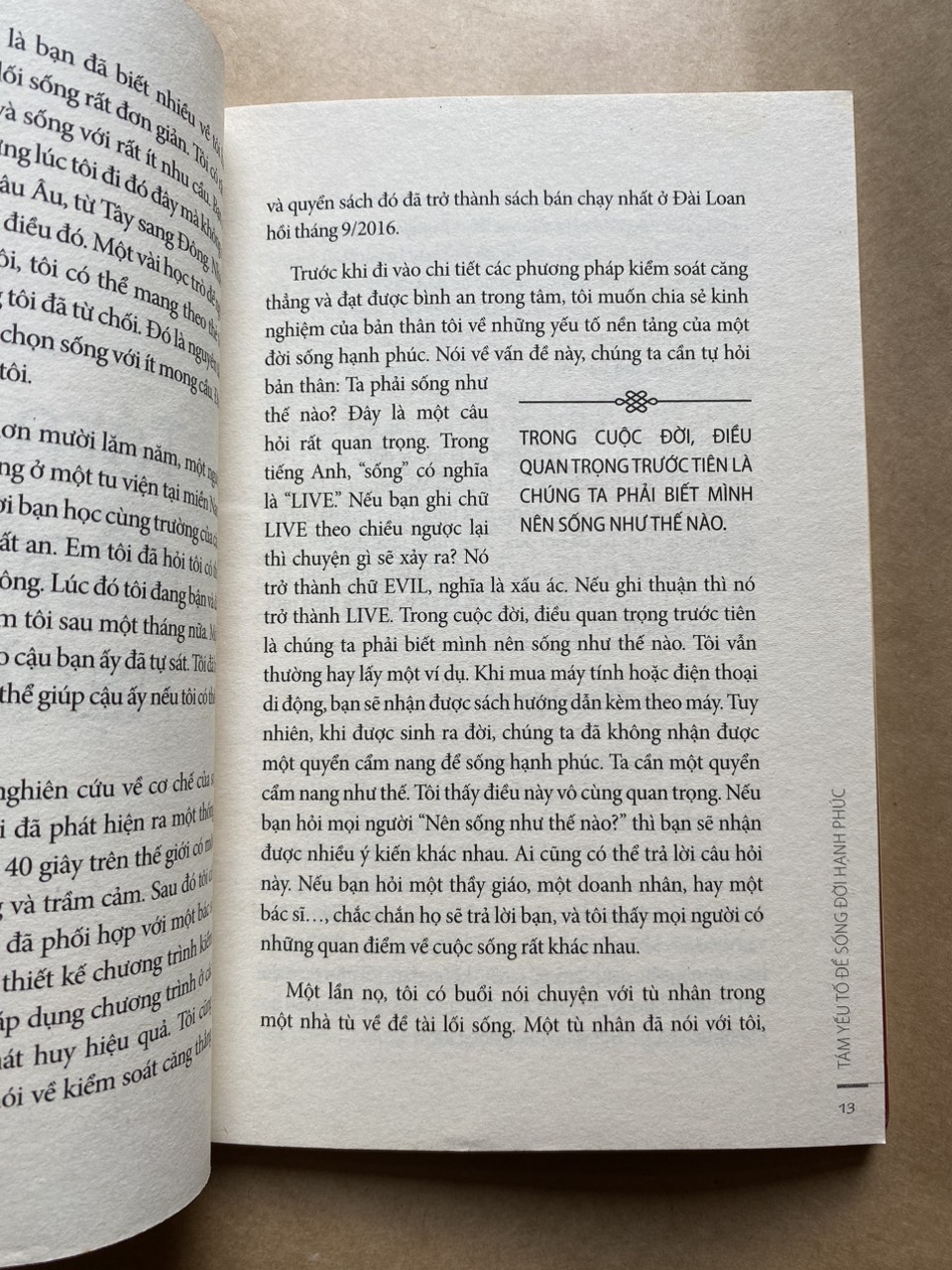 Cung cấp cho người đọc những kiến thức chi tiết về những diễn biến nội tâm, quyển sách nhỏ này giúp người đọc nhận ra những yếu tố để sống đời hạnh phúc như: Cần có động lực sống; Thấu hiểu quy luật tự nhiên; Kiểm soát lòng tham; Đối trị phiền não…. Tám yếu tố mà tác giả đề cập là bản thống kê tương đối đầy đủ nhu cầu để một con người có thể tìm được bình an trong tâm tưởng.