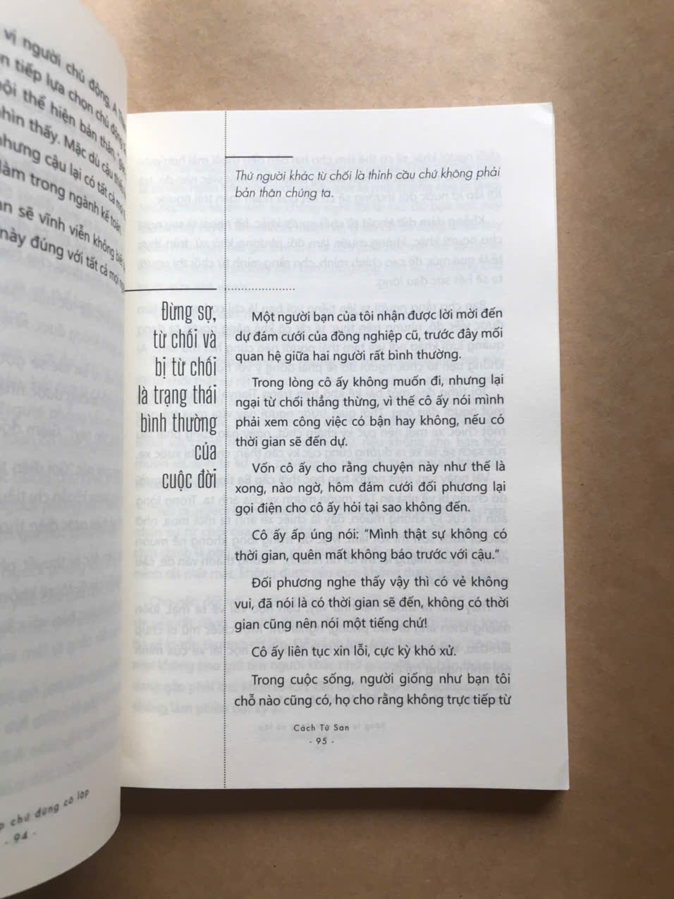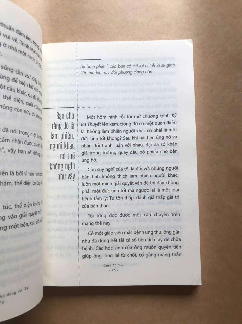 Bằng giọng văn gần gũi thân thiện nhưng không kém phần thẳng thắn, Cách Tử San sẽ mang đến cho bạn đọc một cái nhìn mới mẻ hơn trong việc xây dựng các mối quan hệ cá nhân thông qua việc “làm phiền”. Chúng ta thường hay sợ nhờ cậy, nhờ giúp đỡ từ những người xung quanh vì quan niệm rằng như vậy là đang làm phiền đến đối phương. Sợ làm phiền, thực ra chính là không muốn thừa nhận mình cần người khác, đồng thời cũng cắt đứt những nhu cầu của người khác đối với mình.