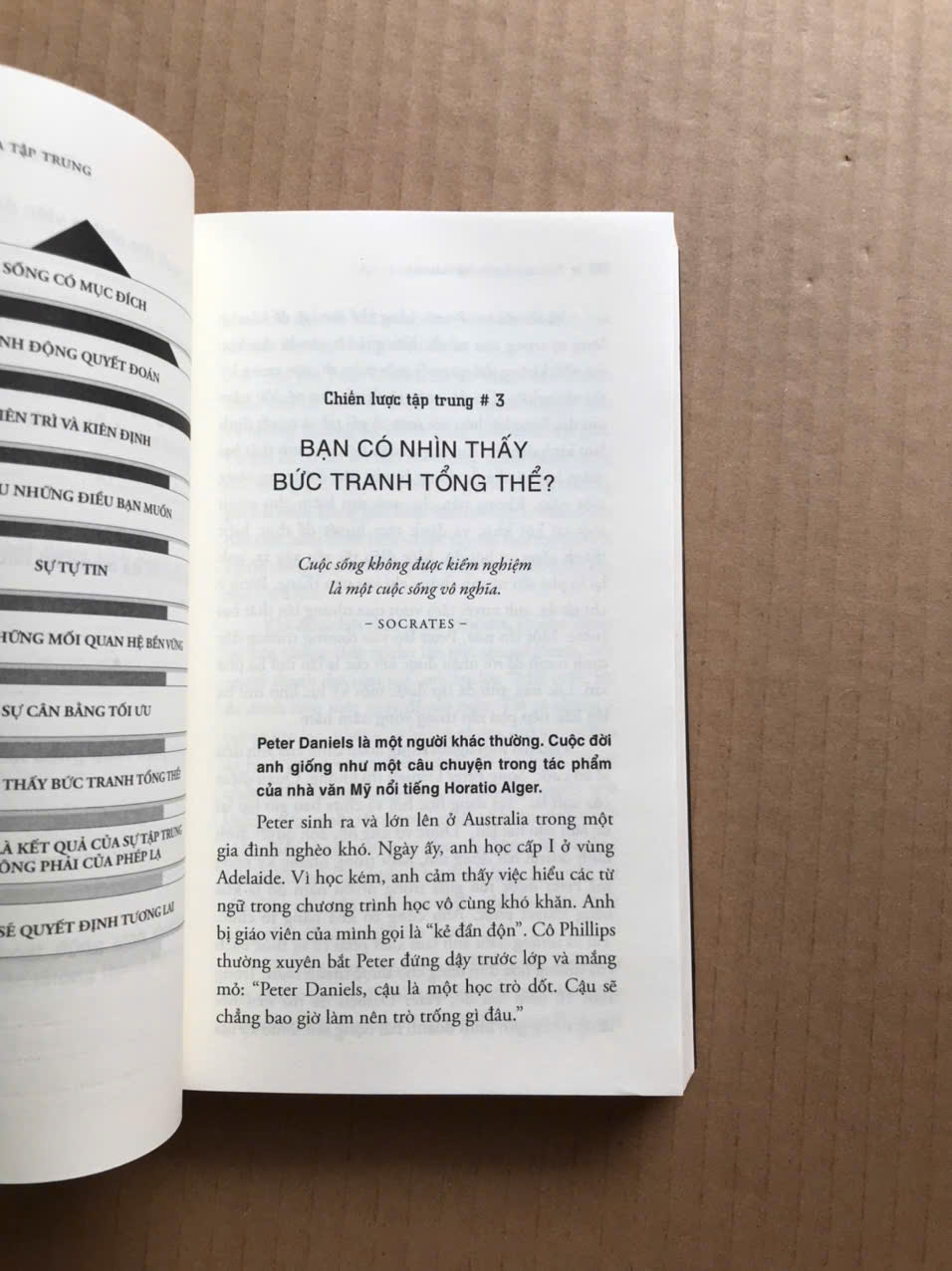 Trong mỗi chương sách là những kế hoạch, phương pháp được minh họa bằng những mẩu giai thoại và những câu chuyện cuốn hút. Đồng thời cuối mỗi chương sách, tác giả đều chỉ ra những phương pháp hành động, những bài tập thực hành để giúp bạn thực hiện quá trình tập trung của mình.