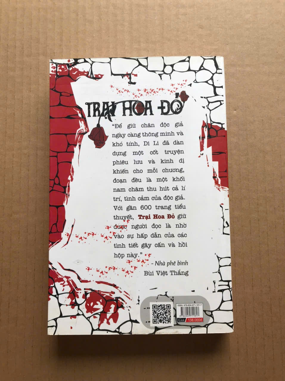 “Trại Hoa Đỏ được phát hành lần đầu tiên năm 2009 nhưng bản thảo tác phẩm đã được nhà văn Di Li đăng tải dần lên mạng từ tháng 10 năm 2007. Qua blog cá nhân của mình, Di Li lần lượt giới thiệu từng chương truyện, chỉ giấu hai chương mở nút cuối cùng. Với kết cấu chặt chẽ, mạch truyện kín, Di Li kể cho người đọc một câu chuyện không hề dễ đoán như các tác phẩm trinh thám thông thường của Việt Nam. Nhân vật chính của tiểu thuyết Trại Hoa Đỏ là Diên Vĩ, một thiếu phụ sang trọng và xinh đẹp. Câu chuyện bắt đầu từ chỗ Diên Vĩ được chồng tặng cho một trang trại nằm lọt giữa một vùng rừng núi âm u, hẻo lánh. Ngay khi đặt chân đến trang trại có nhiều loài hoa đỏ nở kín rừng một cách huyền bí, Diên Vĩ đã thấy có rất nhiều những cảm giác bất an vây bủa xung quanh mình. Những người bản địa thuộc một dân tộc thiểu số kì dị; những cái chết bí ẩn xảy ra liên tục; những truyền thuyết ma quái về dòng họ Quách… đã khiến cho Diên Vĩ thực sự sợ hãi và kinh hoàng trong suốt quãng thời gian có mặt ở Trại Hoa Đỏ. Trong bối cảnh đó, cảnh sát hình sự Phan Đăng Bách, một khách mời của trang trại trong ngày khánh thành, tình cờ trở thành thám tử điều tra những cái chết bí ẩn ở Trại Hoa Đỏ. Cùng thời điểm ấy, người bạn thân nhất của anh bị sát hại khi đang điều tra một tổ chức tội phạm xuyên quốc gia…”