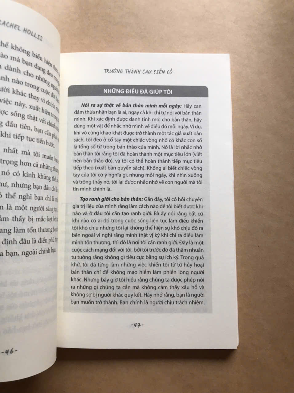 Quyển sách “Trưởng thành sau biến cố” không nhằm mục đích kể lại sự đau khổ, tuyệt vọng hay ấm ức về một điều gì đó, mà nó kể lại hành trình đầy những biến cố mà chính tác giả trải qua đã diễn ra như thế nào và phân tích lý do tại sao biến cố lại xảy ra, cũng như cách mà tác giả Rachel Hollis đối diện và vượt qua chúng.