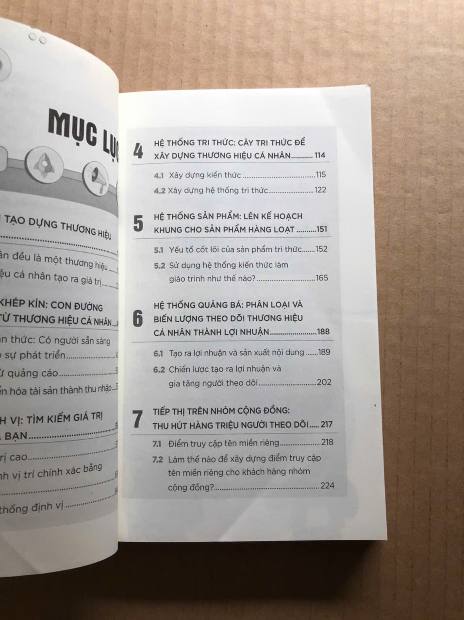 - Chương 7 và chương 8 giới thiệu hai phương pháp cơ bản và hữu dụng nhất để truyền bá và kiếm tiền từ thương hiệu cá nhân, đồng thời chia sẻ và phân tích một cách tỉ mỉ – marketing cộng đồng và tạo dựng ma trận số cá nhân. Mục đích của cuốn sách nhằm giúp độc giả dễ dàng nắm bắt kỹ năng và lập tức có thể chuyển đổi thành tài sản. Đây là sự khích lệ lớn nhất đối với bản thân, cũng là động lực lớn nhất để tiếp tục học tập.