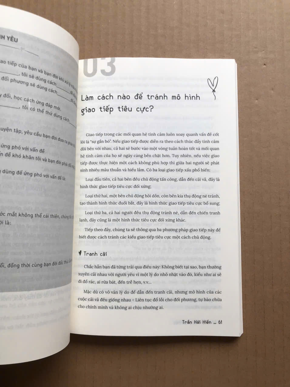 Trong 06 chương của cuốn sách “Yêu, cần phải học”, chuyên gia Trần Hải Hiền, người đã có hơn 10 năm kinh nghiệm hàn gắn các mối quan hệ tình cảm, đã “vẽ đường” cho các cặp đôi “yêu đúng cách” hơn. Tác giả khuyến khích các cặp đôi giải quyết mâu thuẫn thường gặp một cách lành mạnh và tích cực, như: